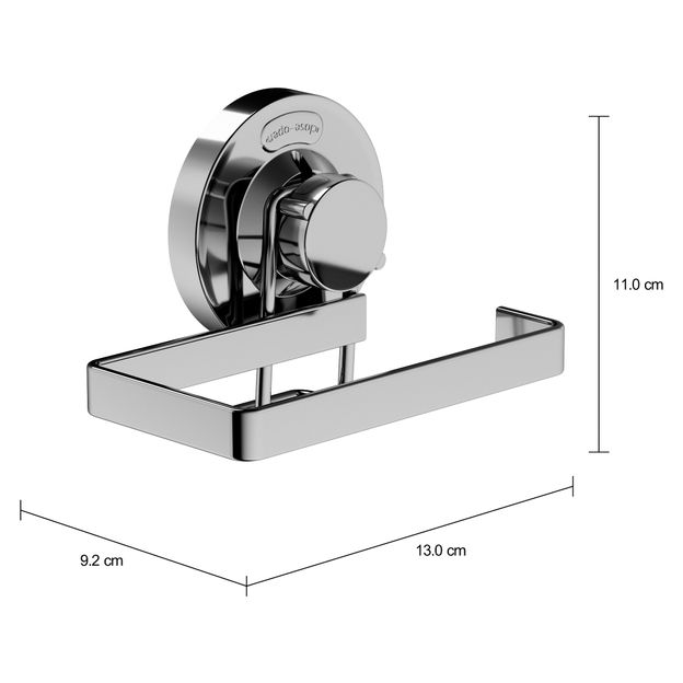 Porta-papel higiênico, para parede, em aço com acabamento cromado e detalhes em ABS. Possui sistema de sucção por ventosas de borracha para fixação em superfícies lisas como espelhos, vidros e azulejos.