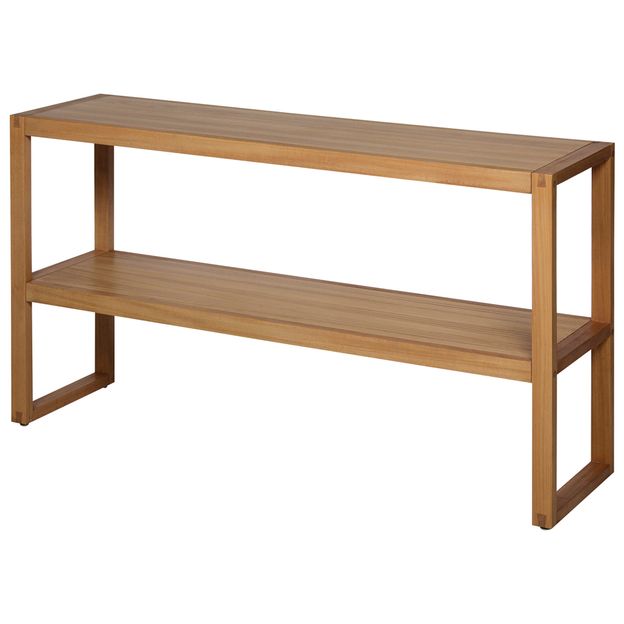 Aparador com estrutura em madeira maciça (Tauari) e tampo e prateleira em aglomerado laminado (Tauari), tingidos manualmente com aplicação de selador e parafina com acabamento escovado. Possui 1 prateleira.