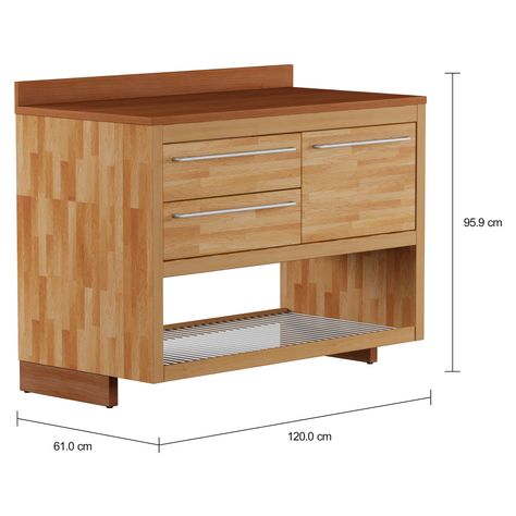 Módulo inferior em madeira maciça (Tauari, entre outras) tingida, encerada com bordas desgastadas. Possui 2 gavetas com corrediças telescópicas, 1 porta basculante, 1 prateleira e puxadores em metal, e pés deslocáveis com sapatas reguláveis.Tampo em madeira maçica (Tauari, entre outras) tingida com acabamento encerado e bordas desgastadas. Para o uso com módulo inferior da mesma linha (vendido separadamente).