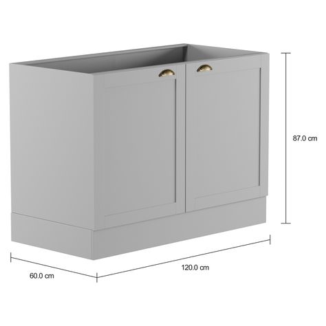 Armário inferior em MDF (Medium Density Fiberboard) com acabamento em pintura poliuretânica. Possui 2 portas, 3 nichos, pés plásticos reguláveis, rodapés removíveis e recortes para passagem do sifão. Acompanha puxador em zamac envelhecido.