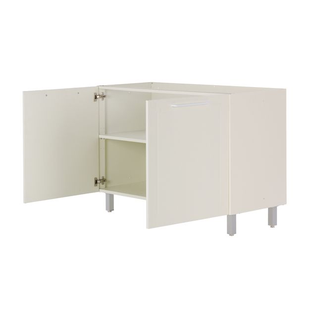 Módulo inferior em chapa de aço galvanizado pré-pintado com acabamento texturizado. Possui 2 portas, 3 nichos, pés em tubo de alumínio escovado e sapatas plásticas reguláveis. Para uso com tampo ou pia da mesma linha (vendidos separadamente).
