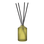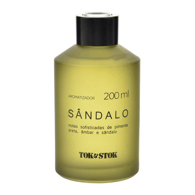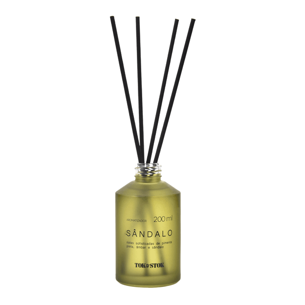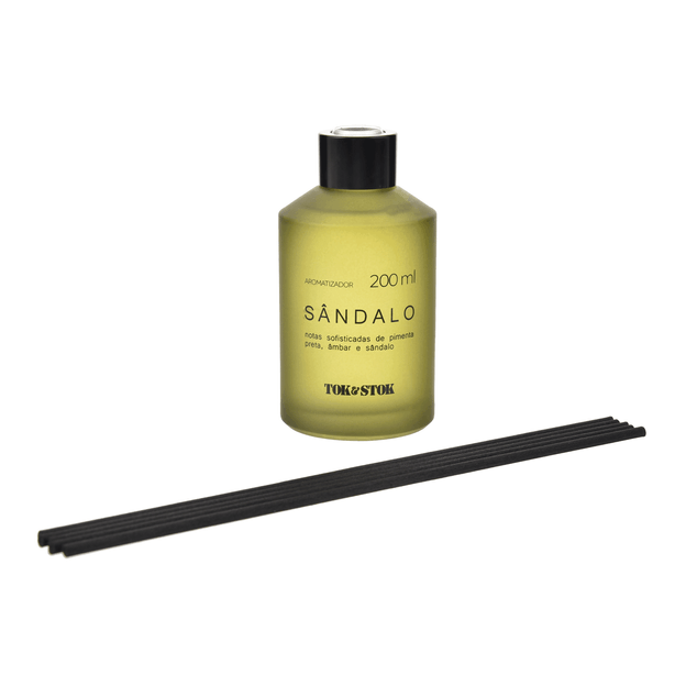 Aromatizador de ambiente à base de essência de sândalo. Acondicionado em embalagem de vidro pintado com aplicação de hot stamp. Acompanha varetas de papel.