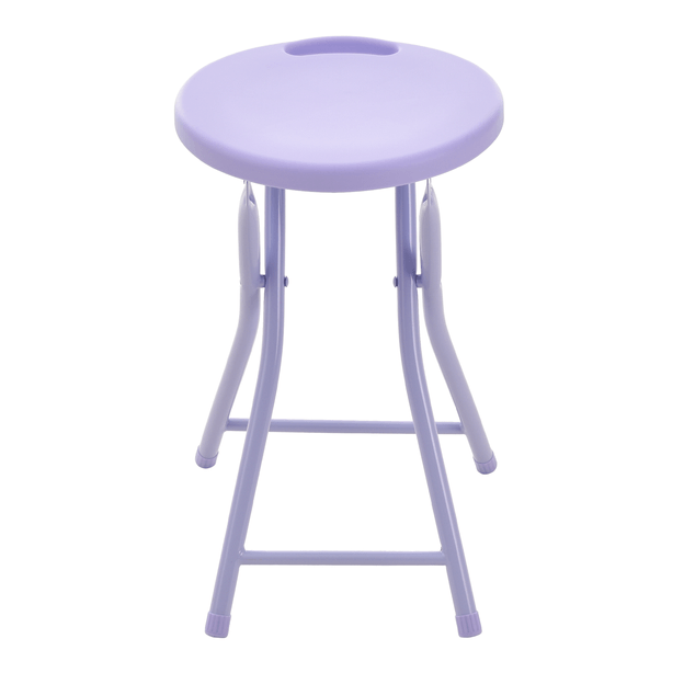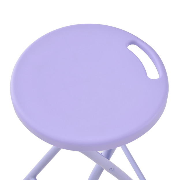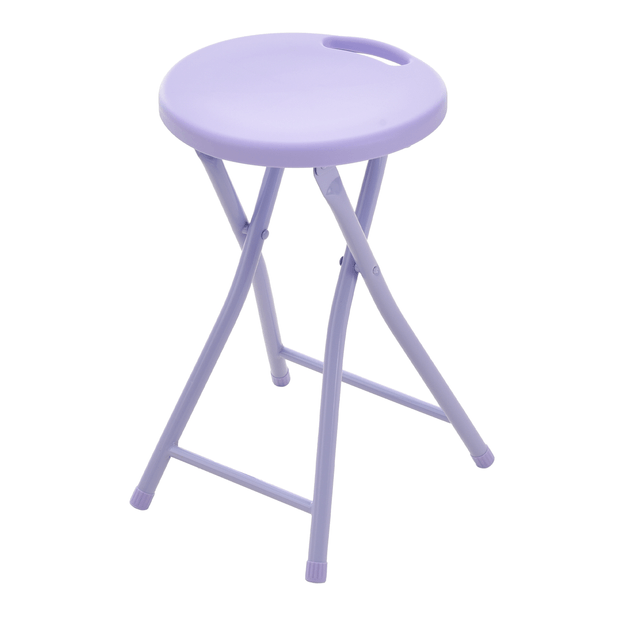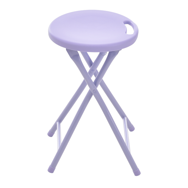 Banco baixo, dobrável, com estrutura em tubo de aço com acabamento em pintura epóxi-pó e assento em polipropileno. Possui sapatas plásticas e pega para manuseio.
