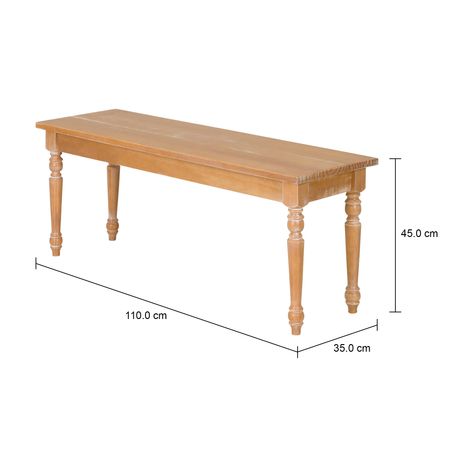 Banco 2 lugares, em madeira maciça de reflorestamento (Pinus Elliottii) tingida com acabamento desgastado e aplicação de verniz. Possui pés maciços torneados.