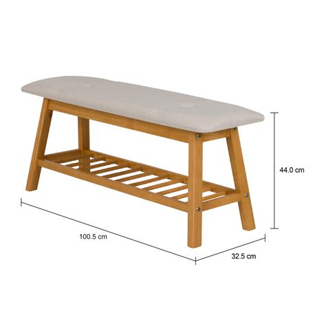 Banco 2 lugares com estrutura em madeira maciça de reflorestamento (Pinus Elliottii) tingida com aplicação de verniz e assento em MDF revestido com espuma (D23) e tecido 100% poliéster. Possui 1 prateleira ripada e aplicação de botonê no assento.