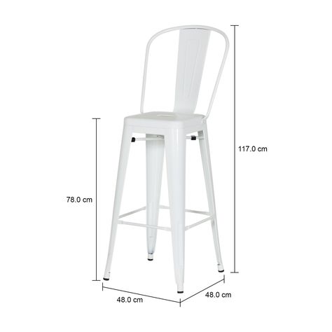 Banco alto, com encosto, empilhável, em tubo e chapa de aço com acabamento em pintura epóxi-pó. Possui pega para manuseio e sapatas emborrachadas.