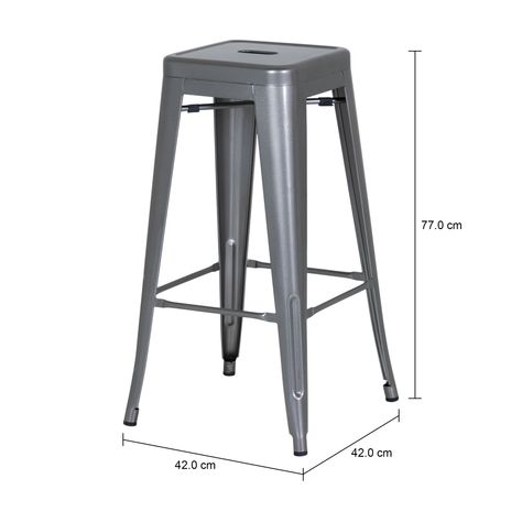 Banco alto, empilhável, em tubo e chapa de aço com acabamento em pintura epóxi-pó. Possui pega para manuseio e sapatas emborrachadas.