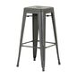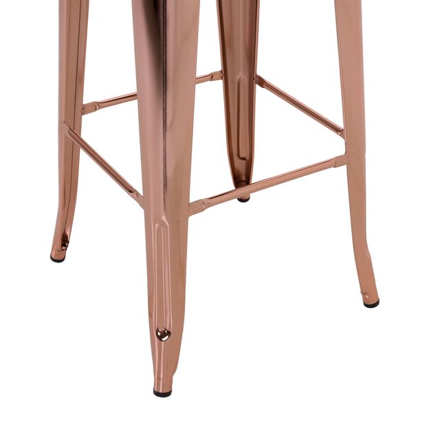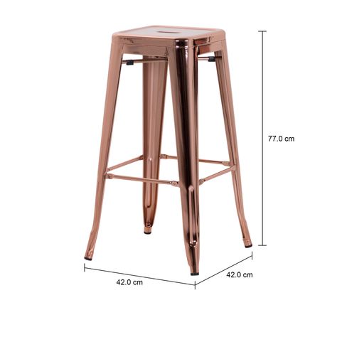Banco alto, empilhável, em tubo e chapa de aço com acabamento em banho de cobre e aplicação de verniz. Possui pega para manuseio e sapatas emborrachadas.