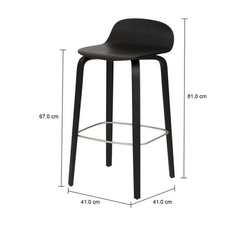 Banco alto com base, assento e encosto em madeira compensada (Bétula), revestida com lâmina natural (Olmo), curvadas e tingidas com aplicação de verniz. Possui apoio para os pés em tubo de aço cromado e sapatas plásticas.