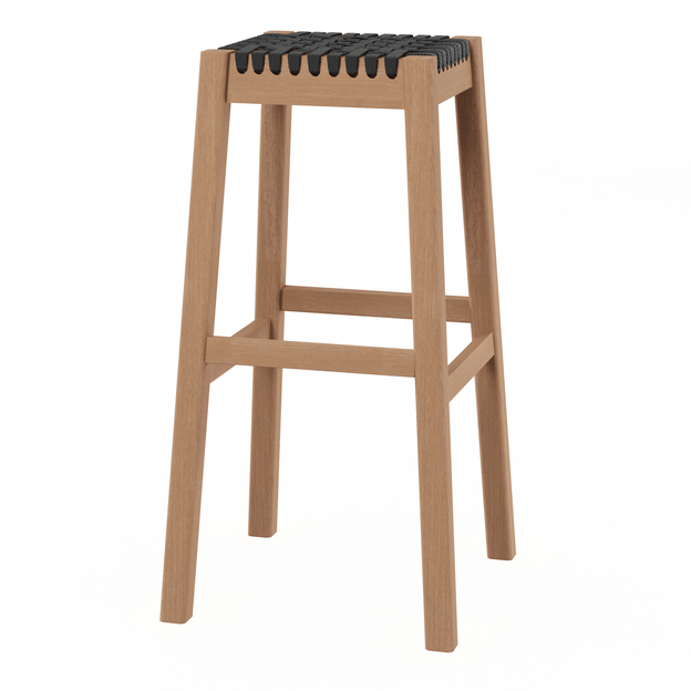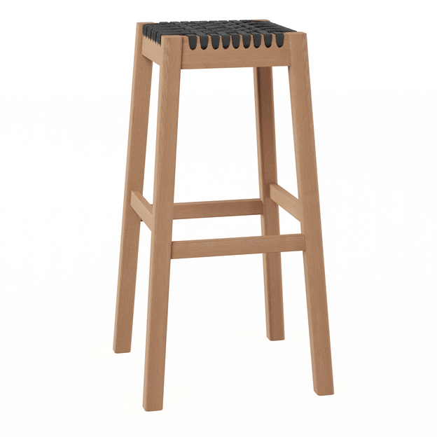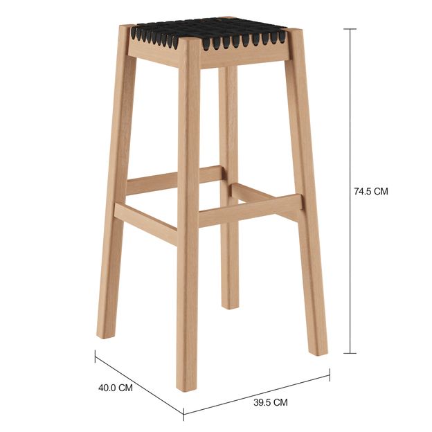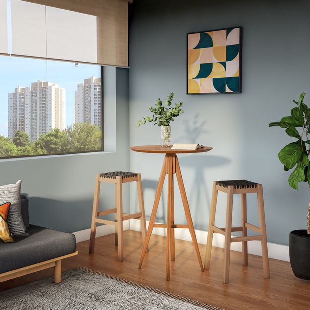 Banco alto, com estrutura em madeira maciça de reflorestamento (Eucalipto) com acabamento em tingidor impermeabilizante, tipo stain, com ação inseticida e fungicida. Possui assento em corda naval 100% pet reciclado e sapatas plásticas.