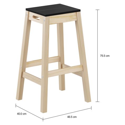 Banco alto, com estrutura em madeira maciça de reflorestamento (Pinus Elliottii) tingida com aplicação de verniz e assento em MDF (Medium Density Fiberboard) com acabamento em pintura laqueada. Possui laterais com recorte usinado para manuseio.