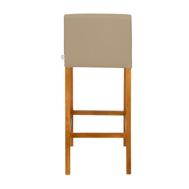 Banco alto, com estrutura em madeira maciça (Tauari) tingida com aplicação de verniz poliuretano. Possui assento e encosto em compensado multilaminado com espuma (D26/assento e D20/encosto) e revestimento sintético poliuretano.