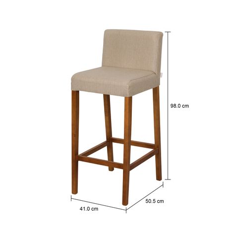 Banco alto, com estrutura em madeira maciça (Tauari) tingida com aplicação de verniz poliuretano. Possui assento e encosto em compensado multilaminado revestido com espuma (D26/assento e D20/encosto) e tecido 58% polipropileno/42% olefin.