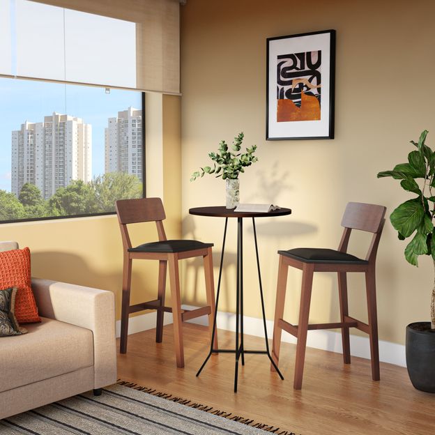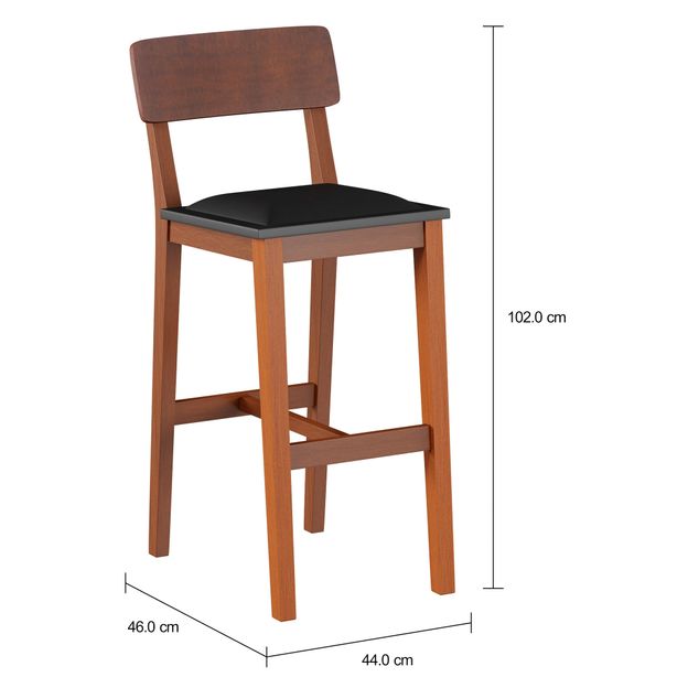 Banco alto, com estrutura em madeira maciça (Eucalipto) e encosto em compensado revestido com lâmina natural (Embuia), tingidos, com acabamento em verniz poliuretano. Possui assento em espuma (D28) e revestimento sintético em PVC.