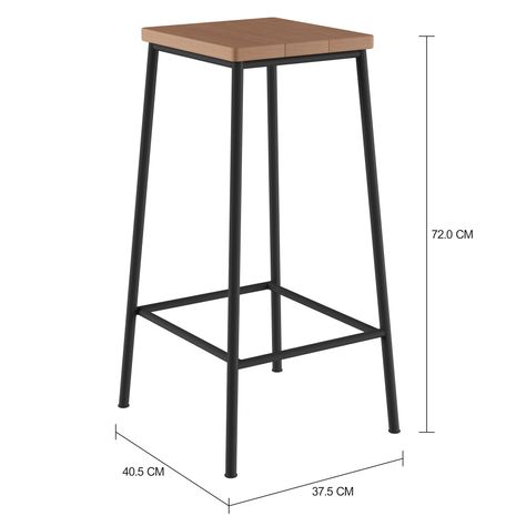 Banco alto, com estrutura em tubo de aço com acabamento em pintura epóxi-pó e assento em madeira maciça de reflorestamento (Eucalipto) com aplicação de stain. Possui sapatas plásticas.