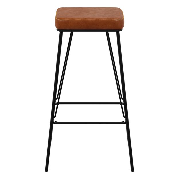 Banco alto, com estrutura em perfil de aço com acabamento em pintura epóxi-pó e assento em compensado multilaminado com espuma (D32) e revestimento sintético poliuretano. Possui detalhes em pesponto e sapatas plásticas.