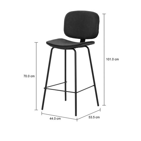 Banco alto, com estrutura em tubo de aço com acabamento em pintura epóxi-pó e assento/encosto em compensado com espuma (D24) e revestimento sintético poliuretano. Possui detalhes em pespontos e sapatas plásticas.