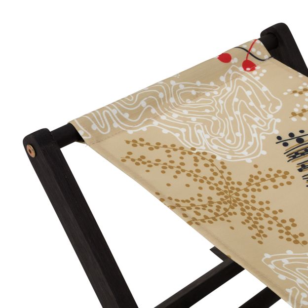 Banco baixo, dobrável, com estrutura em madeira maciça (Eucalipto) com acabamento em tingidor impermeabilizante, tipo stain, com ação inseticida e fungicida, e assento em tecido estampado 100% poliéster com aplicação de tratamento 'Fiprotec Ultra'.