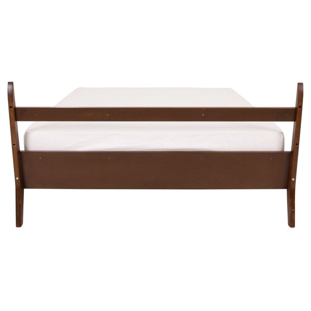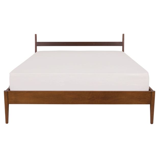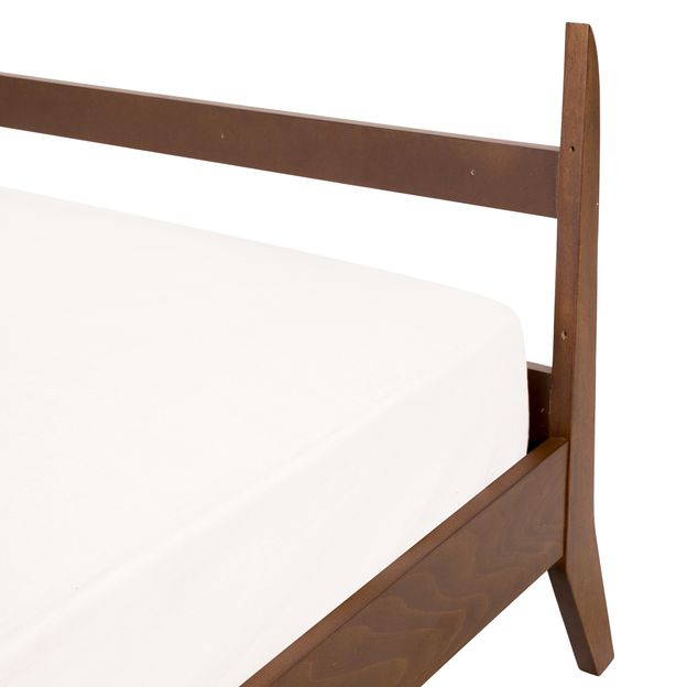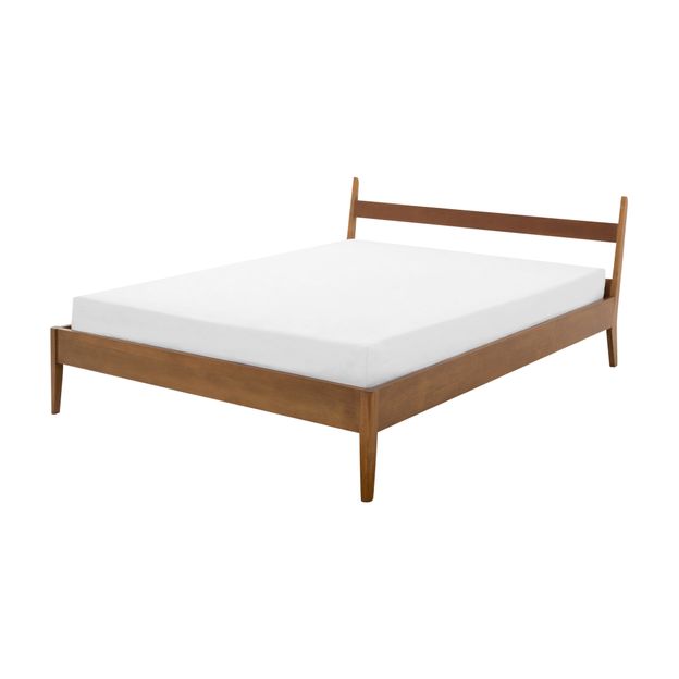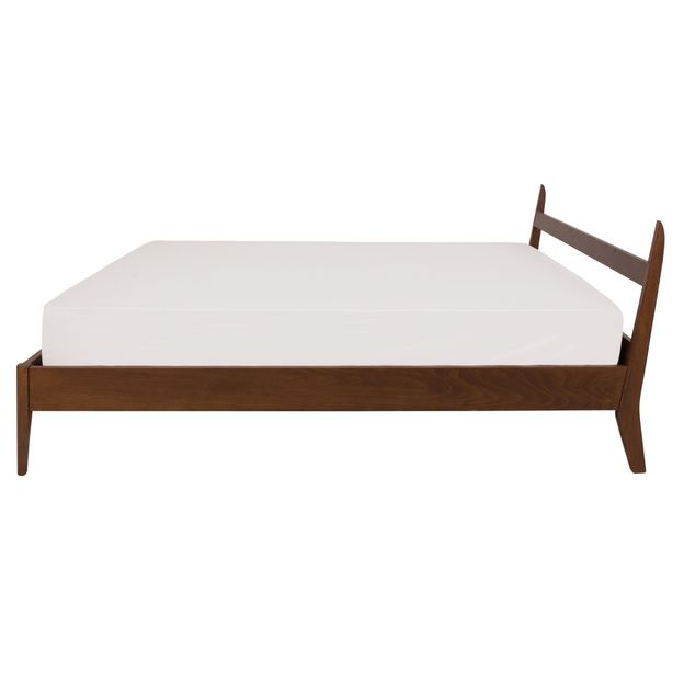 Base de cama queen, em madeira maciça (Tauari) e MDF (Medium Density Fiberboard) tingida com aplicação de verniz. Possui estrado maciço.