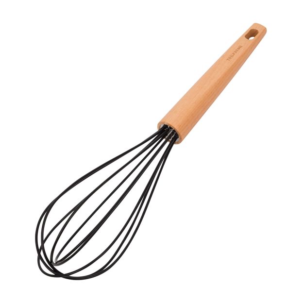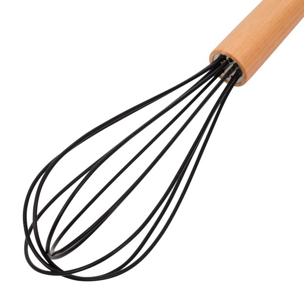 Batedor de claras, em silicone com cabo em madeira maciça (Faia). Possui furo para que possa ser pendurado.