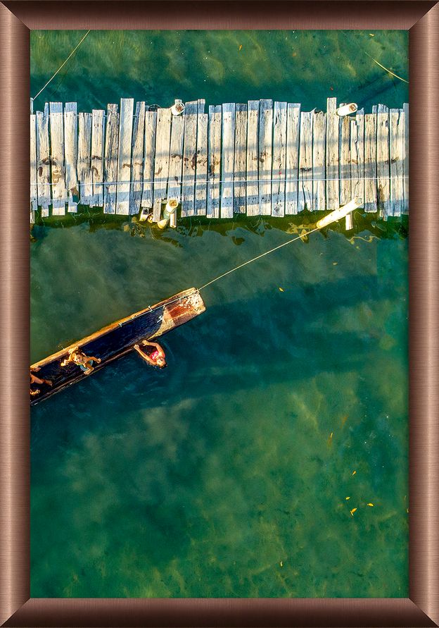 Quadro com moldura em madeira maciça (Pinus Elliottii), visor em vidro incolor e impressão digital em papel fotográfico.