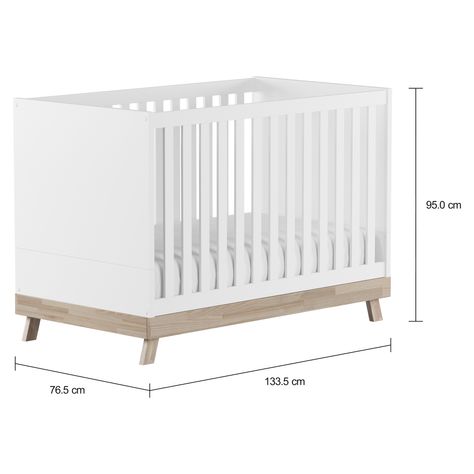 Berço em MDF (Medium Density Fiberboard) com acabamento em pintura e pés em madeira maciça de reflorestamento (Pinus Elliottii) tingida com aplicação de verniz. Possui estrado maciço com 2 regulagens de altura.