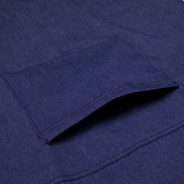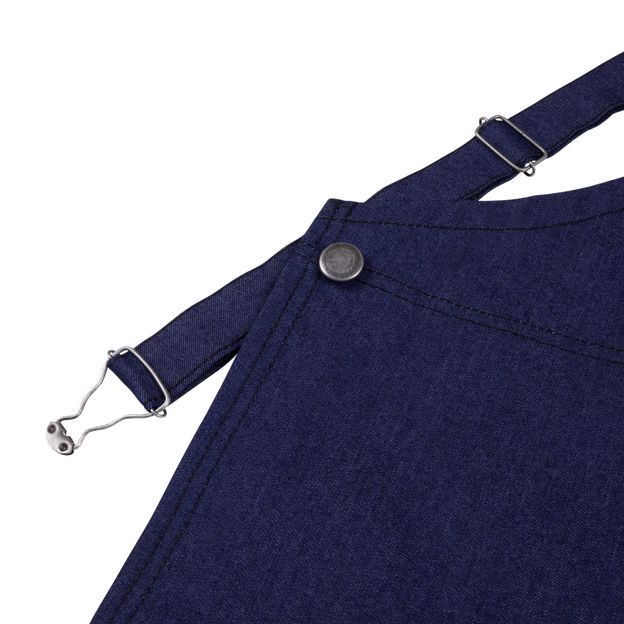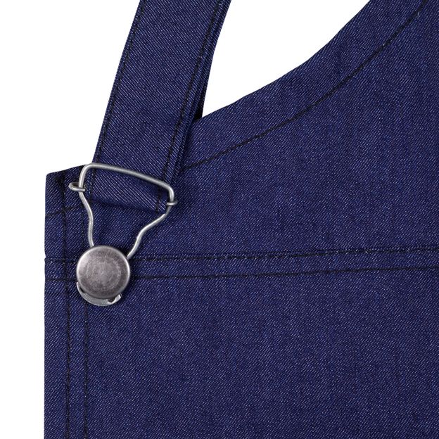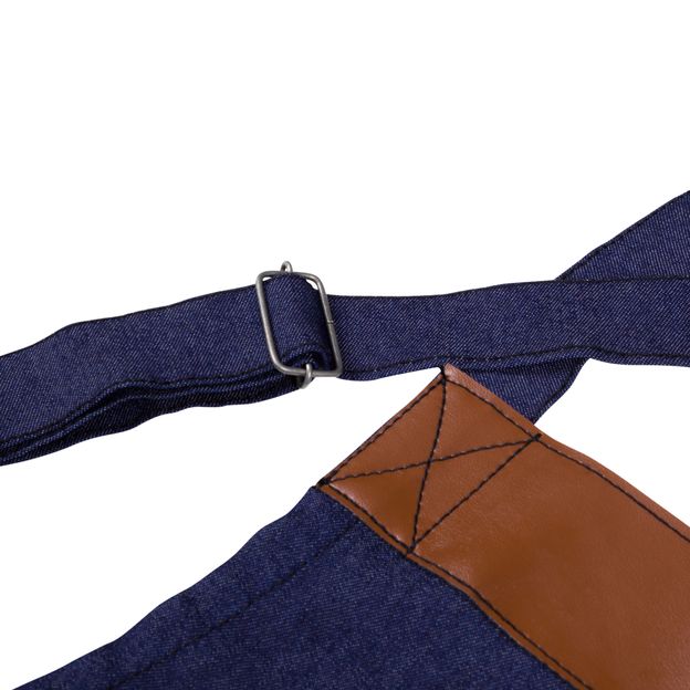 Avental, em tecido jeans 82% algodão/16% poliéster /2% elastano. Possui detalhes em PU (poliuretano), bolso frontal e alças com regulagem para o pescoço e corpo.