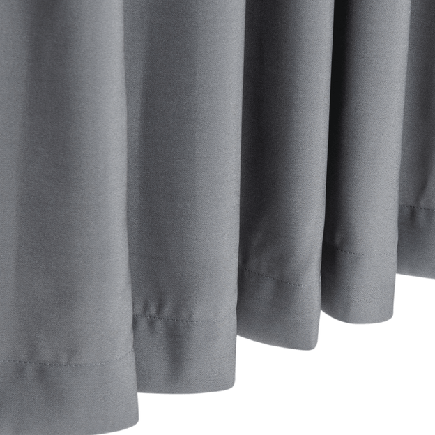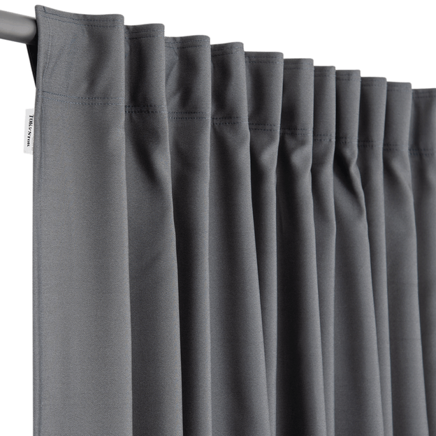 Cortina blackout, em duas peças (com 2 m x 2,50 m cada), em tecido 70% poliéster/ 30% etileno vinil acetato. Possui alças para fixação em suportes.