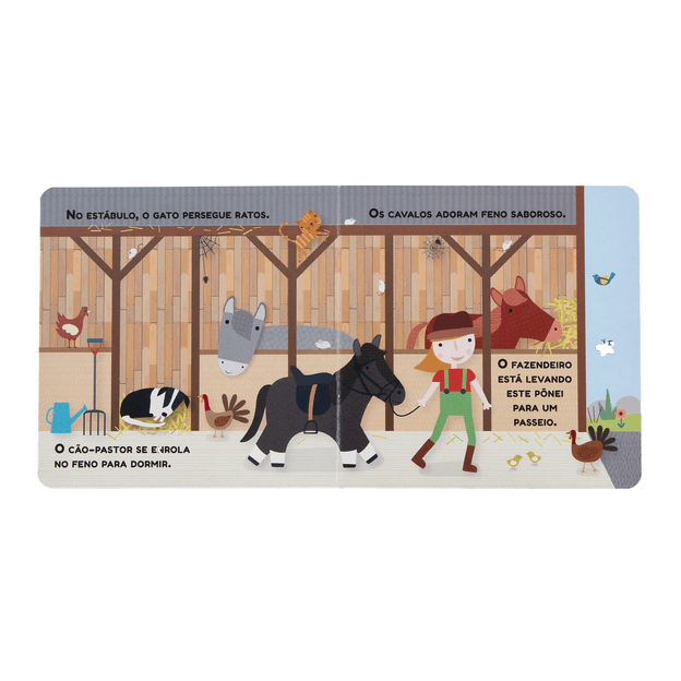 Serão horas de aprendizagem e diversão com este livro cativante, que convida a criança a conhecer os animais e aprender tudo sobre o dia a dia na fazenda.