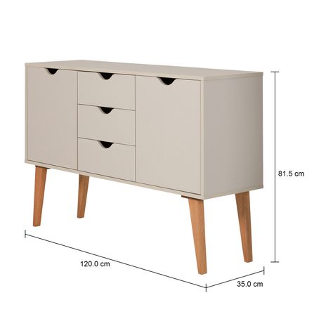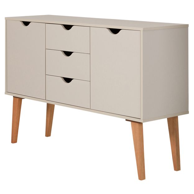 Buffet em MDP de 15 mm revestido com laminado melamínico baixa pressão com bordas em PVC. Possui 2 portas, 4 nichos, sendo 2 prateleiras reguláveis, 3 gavetas com corrediças metálicas e pés em madeira maciça de reflorestamento (Eucalipto) tingida.