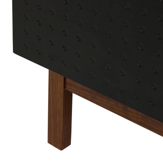 Buffet em MDP de 15 mm com acabamento em pintura poliuretânica. Possui 2 portas em MDF de 18 mm com detalhes em baixo-relevo, 5 nichos, sendo 2 prateleiras reguláveis, e pés em madeira maciça de reflorestamento (Eucalipto) tingida.