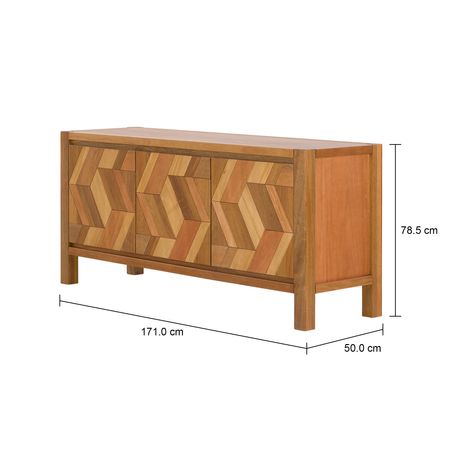 Buffet em madeiras maciças (Tauari, Eucalipto e Pinus Elliottii) tingidas com acabamento encerado. Possui 3 portas em mosaico, confeccionado manualmente, 5 nichos, sendo 1 prateleira regulável, e 1 gaveta com corrediças telescópicas.
