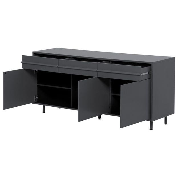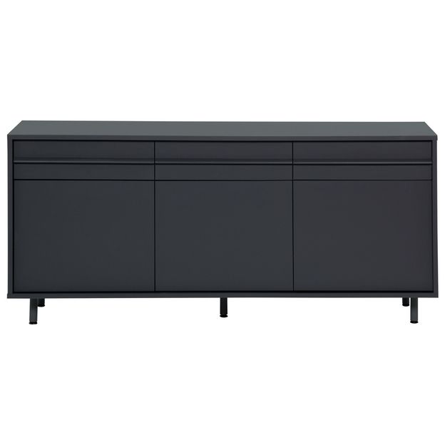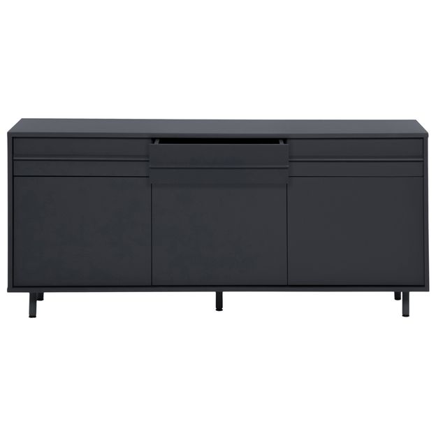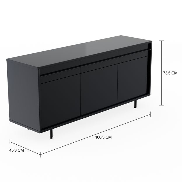 Buffet em MDF (Medium Density Fiberboard) com acabamento em pintura. Possui 3 portas com abertura por fecho-toque, 5 nichos, sendo 2 prateleiras reguláveis, 3 gavetas com corrediças telescópicas e pés em tubo de aço com acabamento em pintura epóxi-pó.