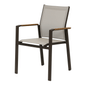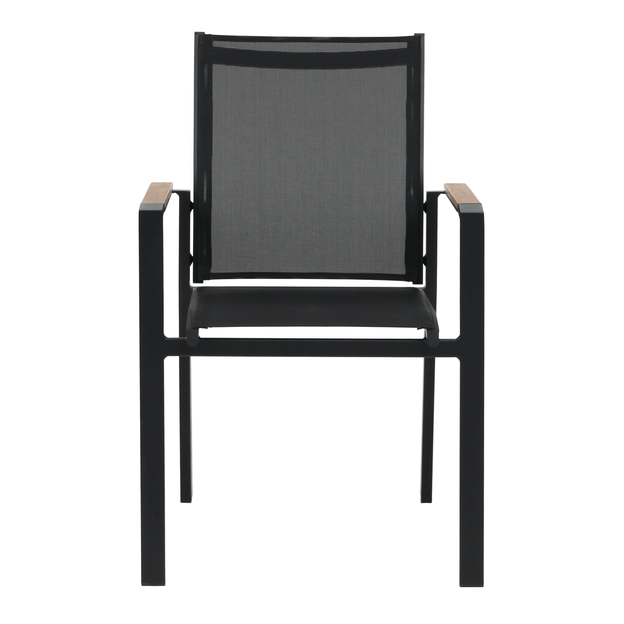 Cadeira com braços, com estrutura em tubo de alumínio com pintura eletrostática à base de poliéster e assento/encosto em tela sintética com filtro de proteção contra radiação UV e apoio de braços em madeira sintética (Polywood). Possui sapatas plásticas.
