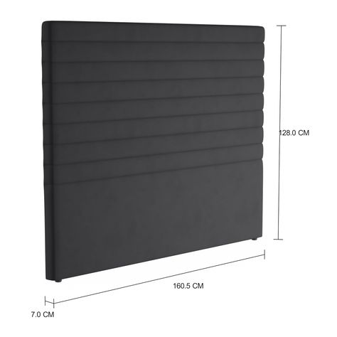 Cabeceira para cama box queen, com estrutura em aglomerado revestido com espuma (D20) e tecido 100% poliéster. Possui aplicação de pesponto e sapatas plásticas. Para uso apoiada ao solo e fixa à parede ou na base box (suporte vendido separadamente).