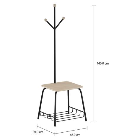 Cabide de piso/banco, em tubo de aço com acabamento em pintura epóxi-pó e madeira maciça (Pinus Elliottii) tingida com aplicação de verniz. Possui 1 prateleira aramada, 3 hastes com ponteiras maciças e sapatas plásticas.
