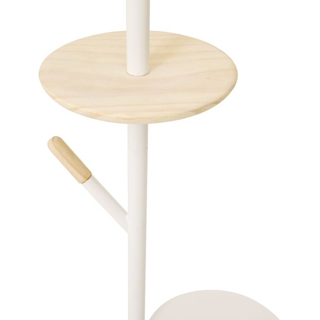 Cabideiro de chão, em tubo e chapa de aço com pintura epóxi-pó. Possui espelho com diâmetro de 45 cm, 2 hastes, 3 prateleiras, sendo 1 central e ponteiras em madeira maciça de reflorestamento (Pinus Elliottii) tingida com aplicação de verniz.