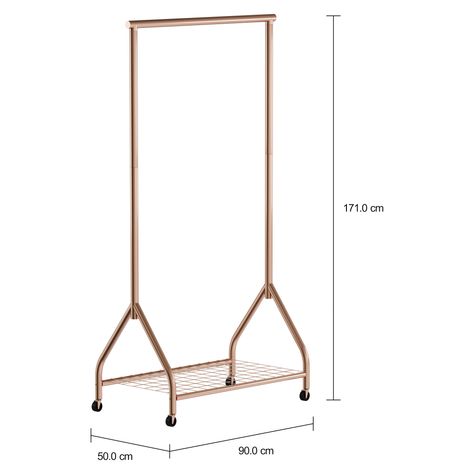 Cabideiro em tubo de aço com acabamento em banho de cobre. Possui 1 prateleira aramada e rodízios em nylon, sem trava.