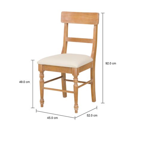 Cadeira em madeira maciça de reflorestamento (Pinus Elliottii) tingida com acabamento desgastado e aplicação de verniz. Possui assento em compensado revestido com espuma (D20) e tecido 63,71% algodão/36,29% poliéster
