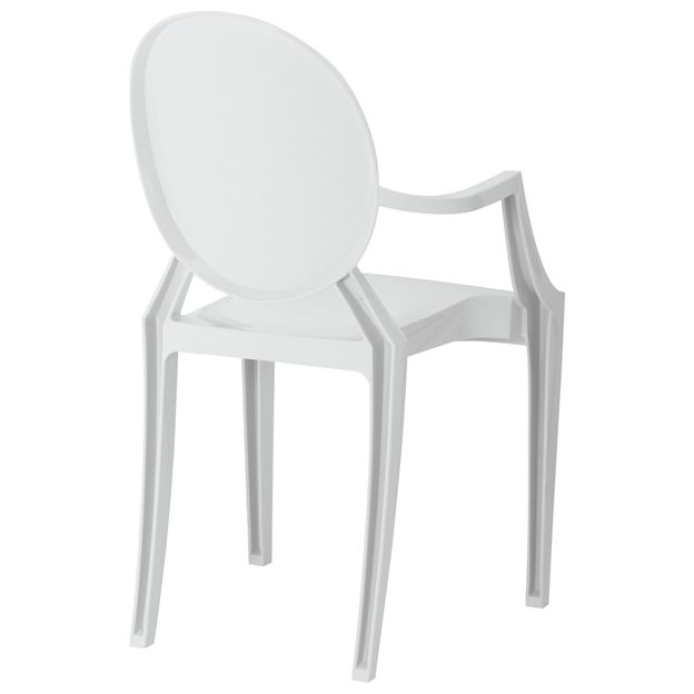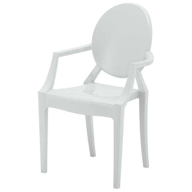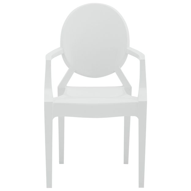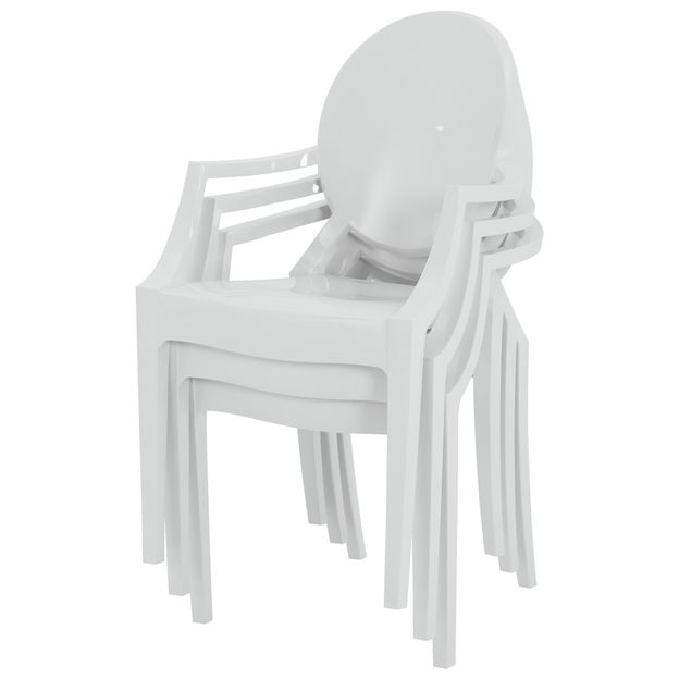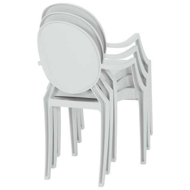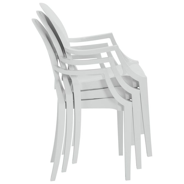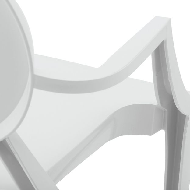 Cadeira com braços, empilhável, em polipropileno com proteção contra radiação ultravioleta.