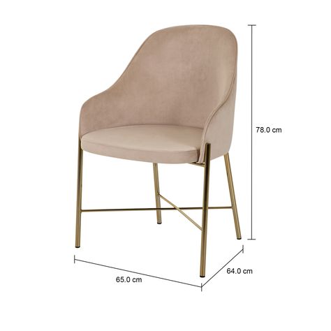 Cadeira com braços, com estrutura em tubo de aço carbono com acabamento em pintura epóxi-pó e assento/encosto em compensado de madeira maciça (Eucalipto) revestido com espuma (D28/assento e D18/encosto) e tecido 100% poliéster, tipo veludo.