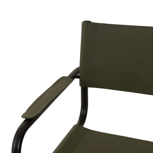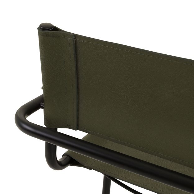 Cadeira com braços, em couro com estrutura em tubo de aço carbono com acabamento em pintura epóxi-pó. Possui encosto com pega para facilitar o manuseio e sapatas plásticas.