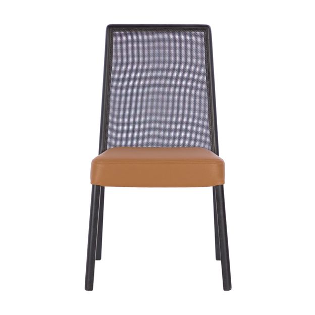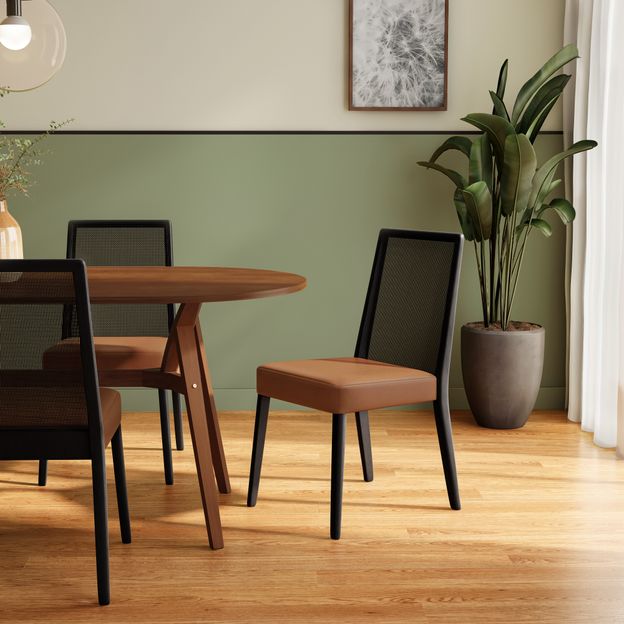 Cadeira com estrutura em madeira maçica (Tauari) tingida com aplicação de verniz poliuretano e assento em espuma e revestimento sintético poliuretano, e encosto em fibra natural trançada.