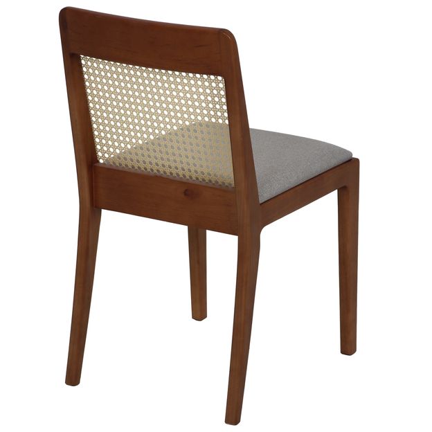 Cadeira com estrutura em madeira maçica (Tauari) tingida com aplicação de verniz poliuretano e assento em compensado multilaminado com espuma (D28) e tecido 100% poliéster, e encosto em fibra natural trançada.