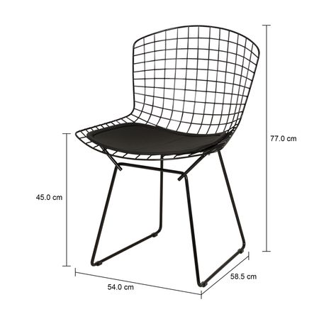 Carga máxima suportável: 120kg. Desenvolvida com base no clássico de Harry Bertoia, em domínio público; sujeita a pequenas variações inerentes ao contexto produtivo atual. Altura até o assento: 48 cm.