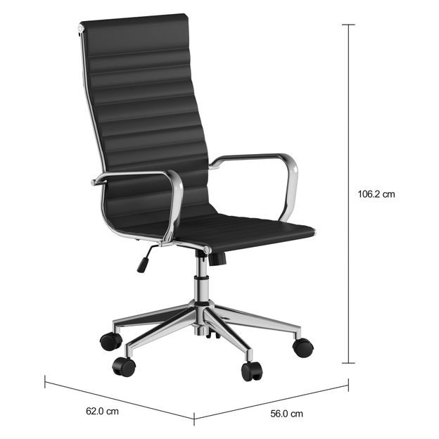 Cadeira giratória, com base e braços em tubo de aço cromado e assento/encosto com espuma e revestimento sintético poliuretano, com densidade D20. Possui regulagem de altura a gás com pistão classe 2, função relax no assento/encosto e rodízios em nylon.