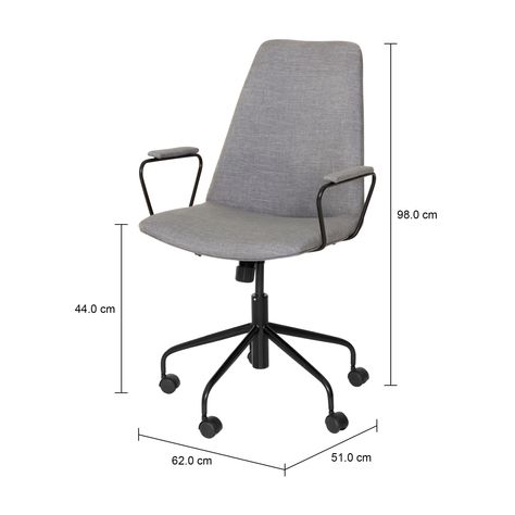 Cadeira giratória, com base em tubo de aço carbono com pintura epóxi-pó e assento/encosto em compensado com espuma (D28) e tecido 73% polipropileno/27% poliéster. Possui apoio para os braços, regulagem de altura a gás e função relax no assento/encosto.