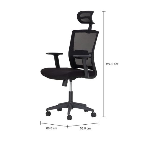 Possui apoio para cabeça e encosto em tela sintética com apoio para lombar. Carga máxima suportável: 110kg.Altura até o assento: 45cm (mínima)/58,4cm (máxima) e até os braços: 64cm (mínima)/77,4cm (máxima).