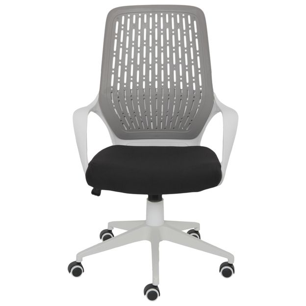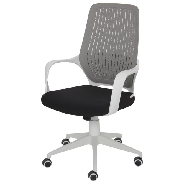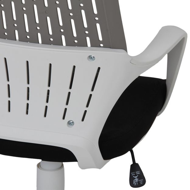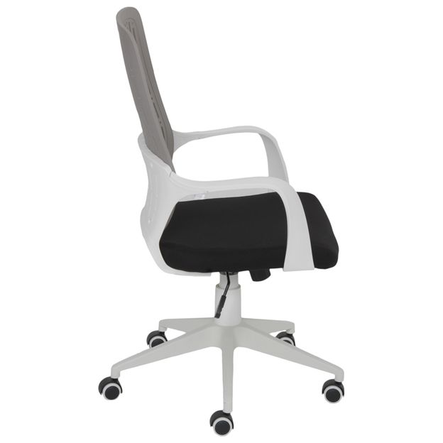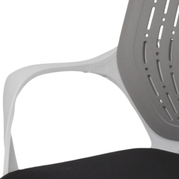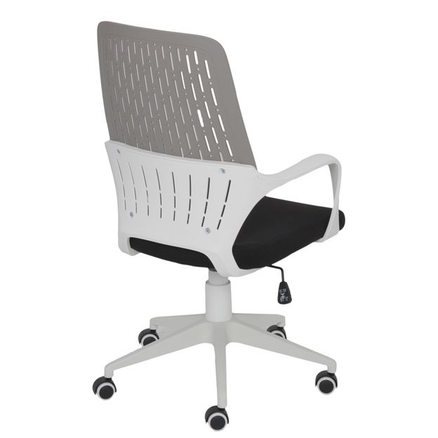 Cadeira giratória, com base em nylon, braços e encosto em polipropileno. Possui assento em compensado revestido com espuma (D30) e tecido 100% poliéster, regulagem de altura a gás e rodízios em nylon.