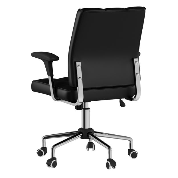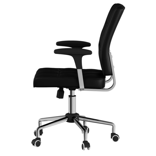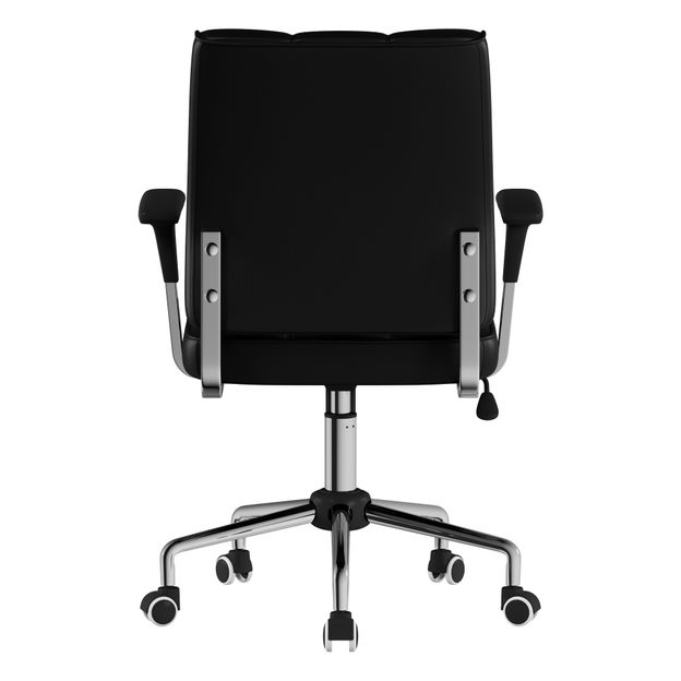 Cadeira giratória, com base em tubo de aço cromado e assento em compensado com espuma (D30/assento e D20/encosto) e revestimento sintético poliuretano. Possui regulagem de altura a gás, função relax no assento e encosto, rodízios e braços em poliuretano.
